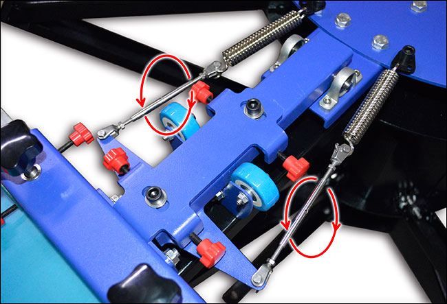 3.Each screen frame fixing device is configured with eight micro adjust knobs. By using the knobs,user can micro adjust the screen frame from front to back, from left to right. It can make the overprinting more simple and more accurate.