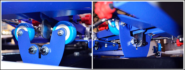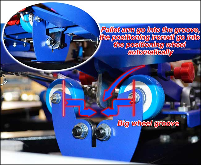4.Each screen frame’s fixing device is equipped with precise positioning wheel, when the positioning iron on the arm placed in positioning wheel closely, it can ensure the printing precision.