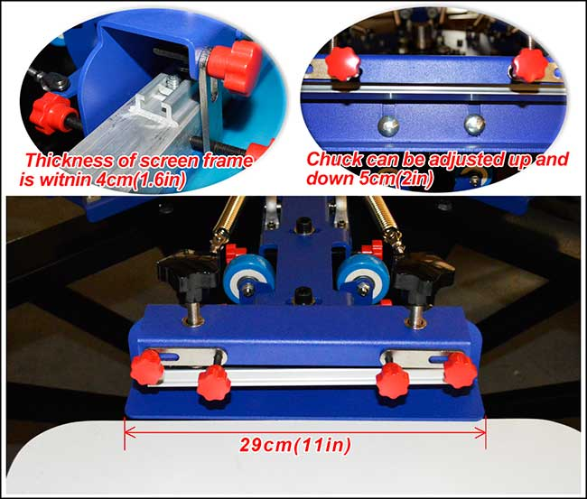 6.Each screen frame’s fixing device is equipped with adjustable height chuck positioning knobs and adjustable height knobs when lift up the screen frame;