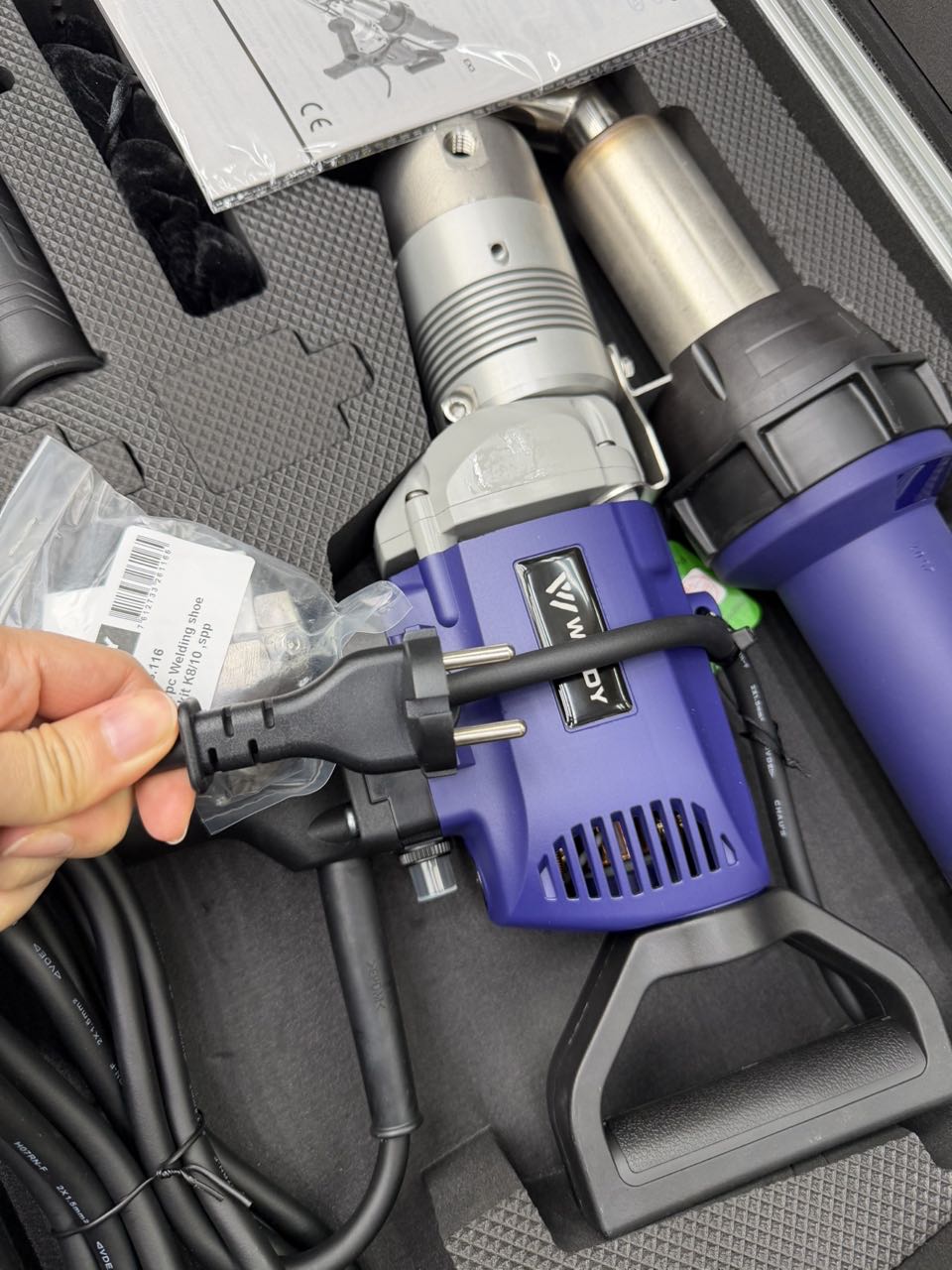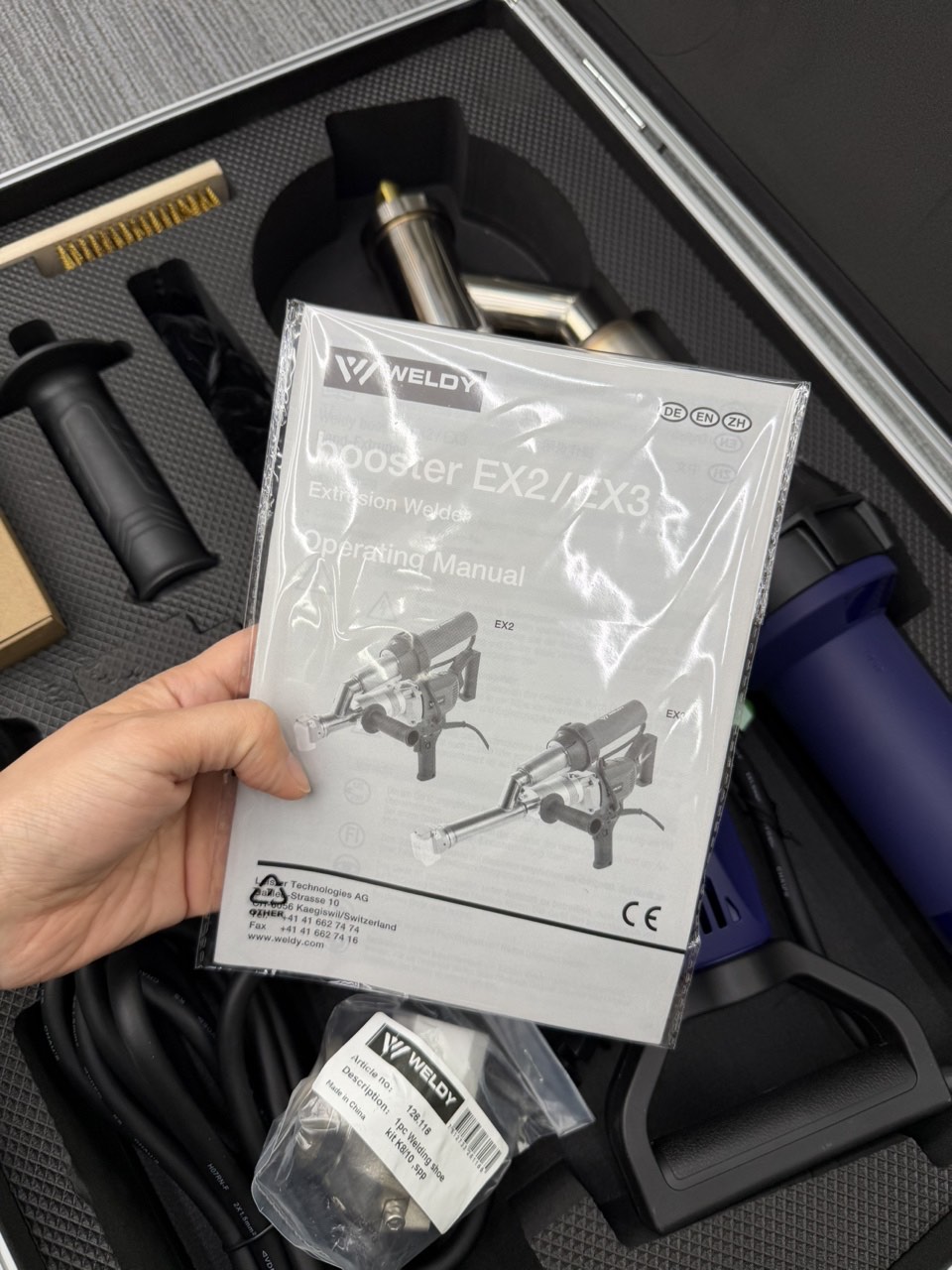 With the booster EX3, the welding rod can be drawn in from both the left and right sides, which facilitates plastic welding work in tight spaces. The booster EX3 extrusion welder has a total of three handles: a handle with lockable drive button, a rotating push handle at the rear of the extruder and a side handle that can be mounted on the left or right as required. This handle facilitates precise guidance of the booster EX3 extrusion welder. The longer design and variable handle positions of this welder allow operators to maintain good posture while working and have good control of the extruder during plastic welding. The Weldy booster EX3 extrusion welder is used for high-quality processing of polyolefins and thermoplastics PE and PP. In contrast to the short and compact booster EX2, the booster EX3 with its maximum output of 3.4 kg/h/7.5 lbs/h is ideal for work that requires a lot of standing. The hand extruder booster EX3 is also successfully used in tank and container construction for sheet thicknesses up to 15 mm/0.6 inches. If thicker welds are required, a larger extruder is more suitable. The durable transport case included in the scope of delivery ensures that the hand extruder and accessories are safe and free of dust/debris.