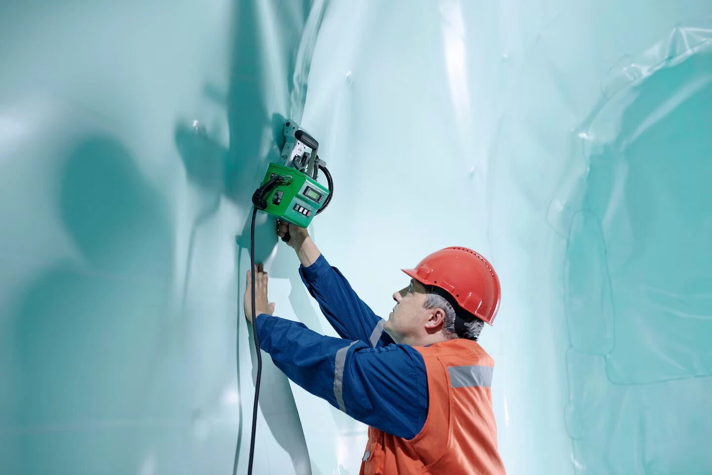 The COMET hot-wedge welding machine is compact and easy to transport. It is used in tunnel construction for overhead welding and vertical sealing.
