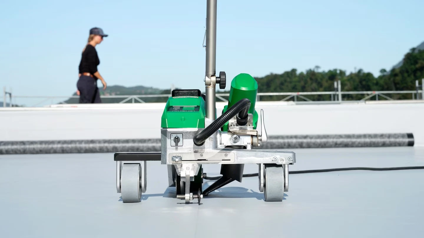 Thanks to its triangular design and variable transport axis, the VARIMAT 500 from Leister stays precisely on track during roof sealing.