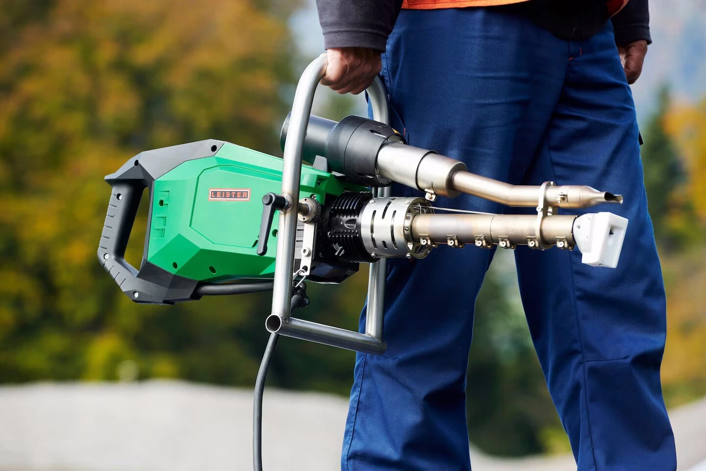 During the development of the Leister WELDPLAST 605 extruder, the cable routing was adapted to the requirements of civil engineering. Therefore, it is positioned vertically, i.e. under the device.