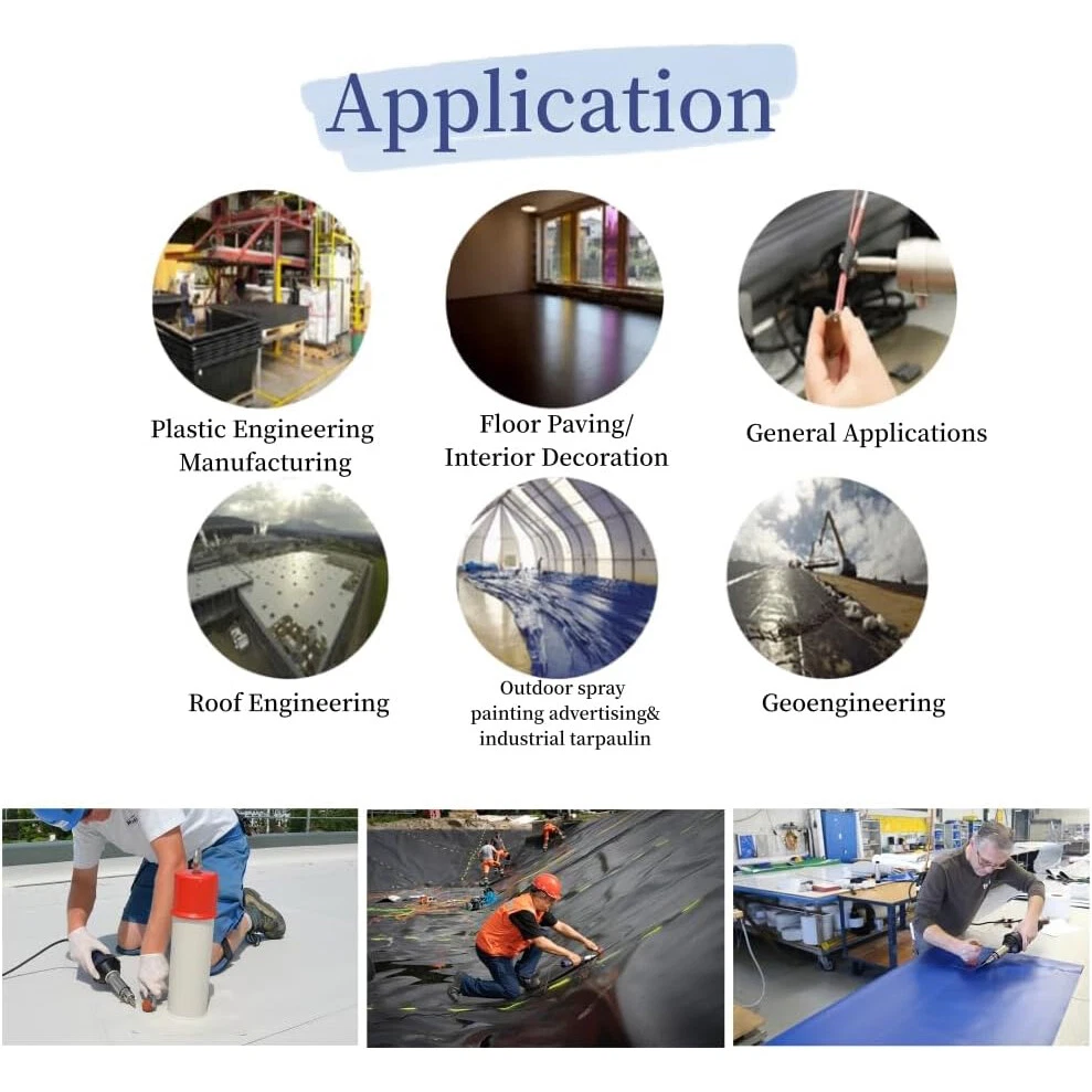The hot torch plastic welding gun tool is widey used for welding PVC film and TPO film, for short and small format materials. Also, this hot blast plastic welding gun welder is suitable for waterproof canvas, tarpaulins, celling cloth, etc